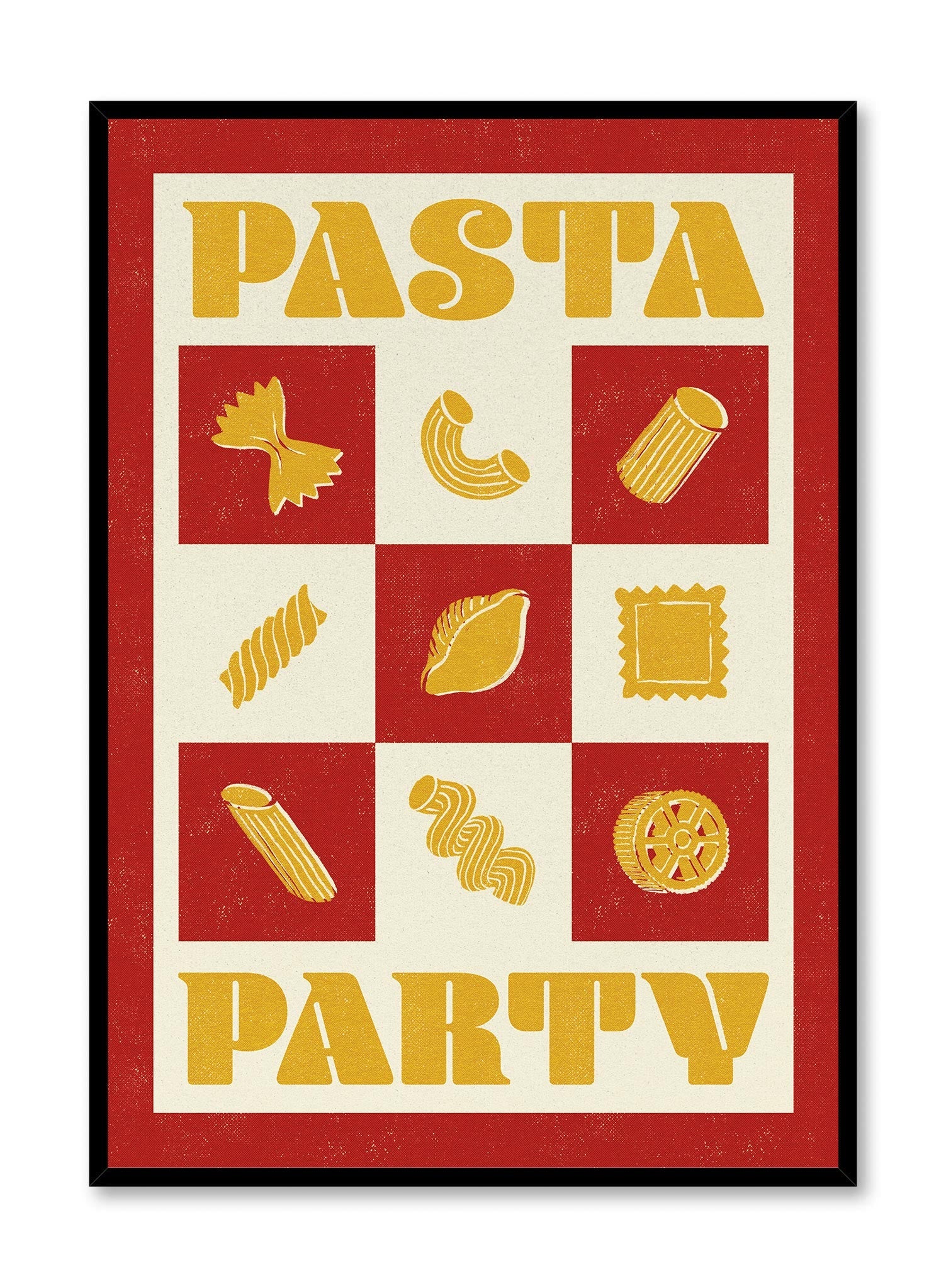 Announce a 'Pasta Party' with this vibrant, graphic art print. The design features a checkerboard grid with nine unique pasta shapes, from farfalle to ravioli, each illustrated in a warm golden-yellow. The bold, block-lettered text at the top and bottom frames the piece, creating a fun and appetizing composition that’s full of character.