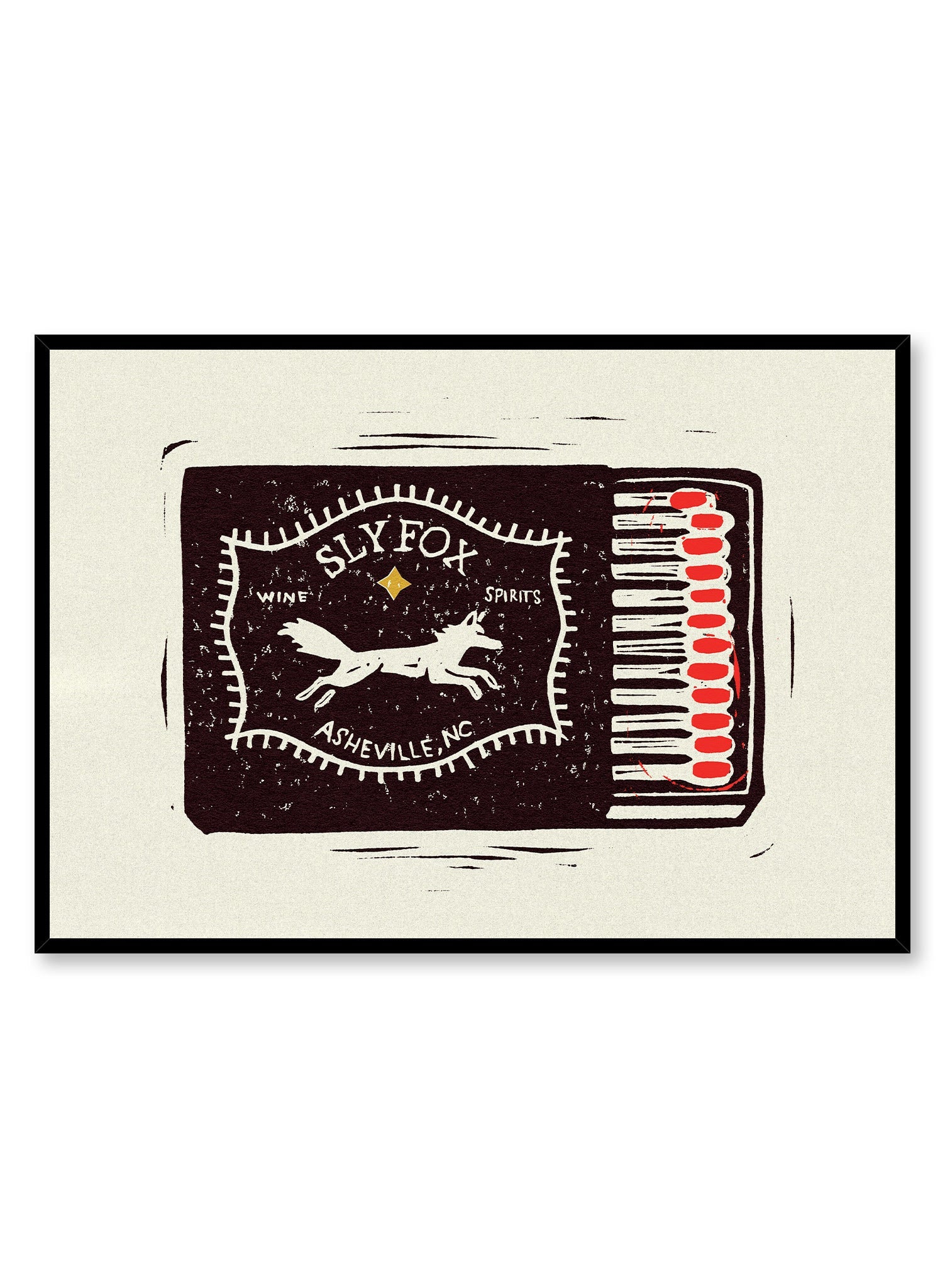 This print features a graphic illustration of a vintage-style matchbook from the 'Sly Fox' bar in Asheville, NC. Rendered in a bold, linocut style, the design includes a leaping fox and classic typography, with a row of red-tipped matches neatly exposed. It’s a playful nod to restaurant ephemera and the tactile quality of a treasured souvenir from a favorite haunt.